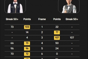 體育資訊12月22日訊 斯諾克蘇格蘭公開賽決賽第一階段,常冰玉2-6落后于韋克林。