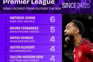 體育資訊10月26日訊 曼聯(lián)在本輪英超4-2力克布萊頓,庫尼亞遠射建功。數(shù)據(jù)統(tǒng)計顯示他也是上賽季至今英超禁區(qū)外破門次數(shù)最多的球員。