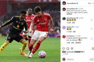 內(nèi)科-威廉姆斯社媒曬出比賽照片,配文調(diào)侃曼聯(lián)蓄發(fā)哥:“我們本應(yīng)得到不止一分,理發(fā)還得再等等?!?/p>