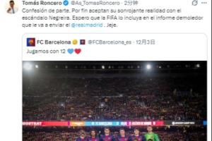 龍賽羅轉(zhuǎn)發(fā)巴薩“第12人”推文:自己招供了!希望皇馬寫進報告里