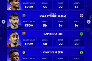 德轉(zhuǎn)評年度最佳左邊鋒名單:迪亞斯、克瓦拉、拉菲尼亞、維尼修斯