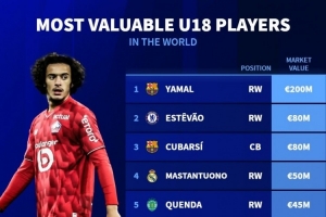 U18球員身價(jià)榜:亞馬爾2億歐居首,埃斯特旺、庫(kù)巴西8000萬(wàn)歐